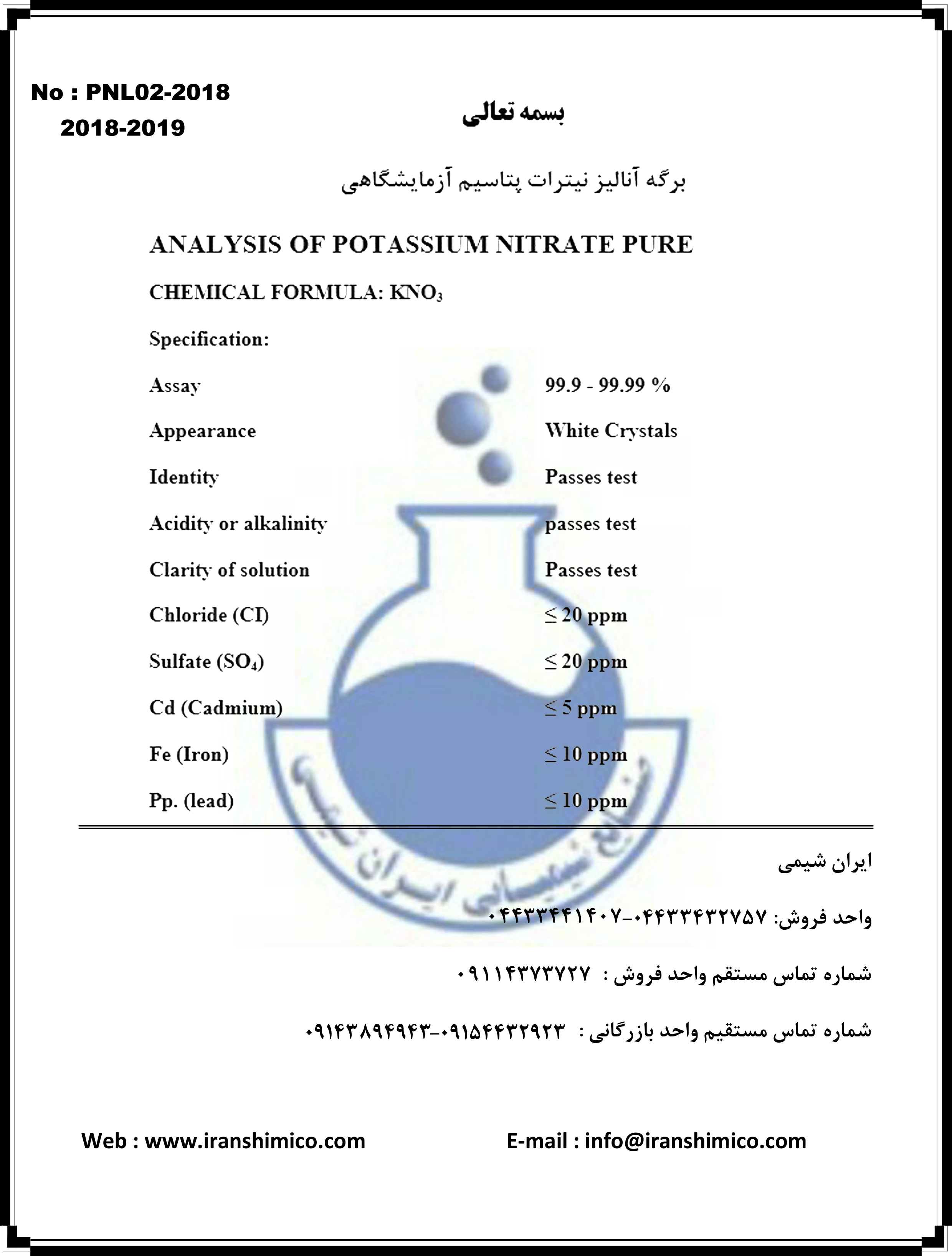 این بخش مخصوص فروش نیترات پتاسیم آزمایشگاهی (Potassium Nitrate) می باشد. در صورت نیاز به خرید ماده ی صنعتی آن به بخش فروش نیترات پتاسیم صنعتی مراجعه فرمایید.
