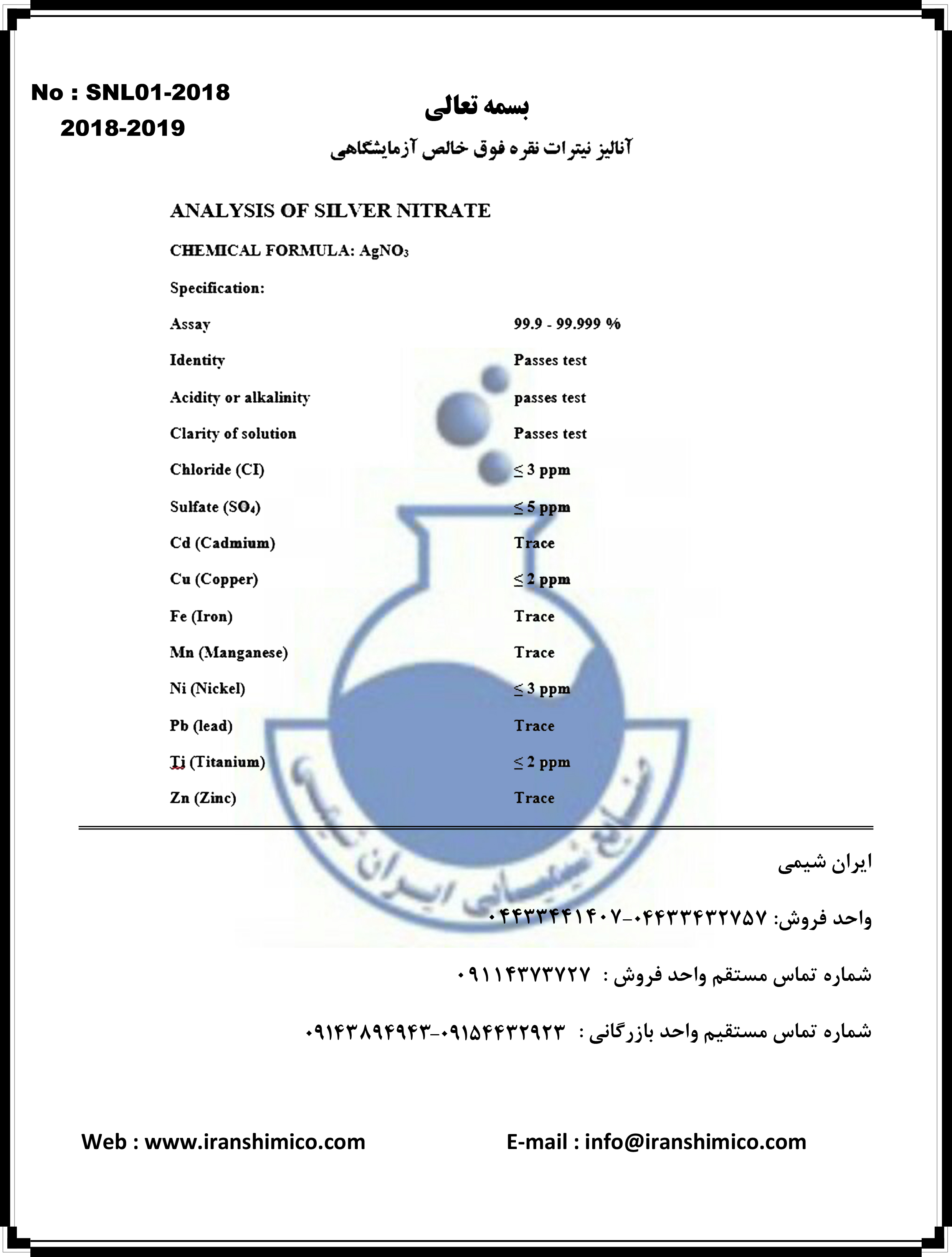 نیترات نقره فوق خالص تولید صنایع ایران شیمی با درصد خلوص بالای 99.9 درصد برای مصارف آزمایشگاهی عرضه می شود .