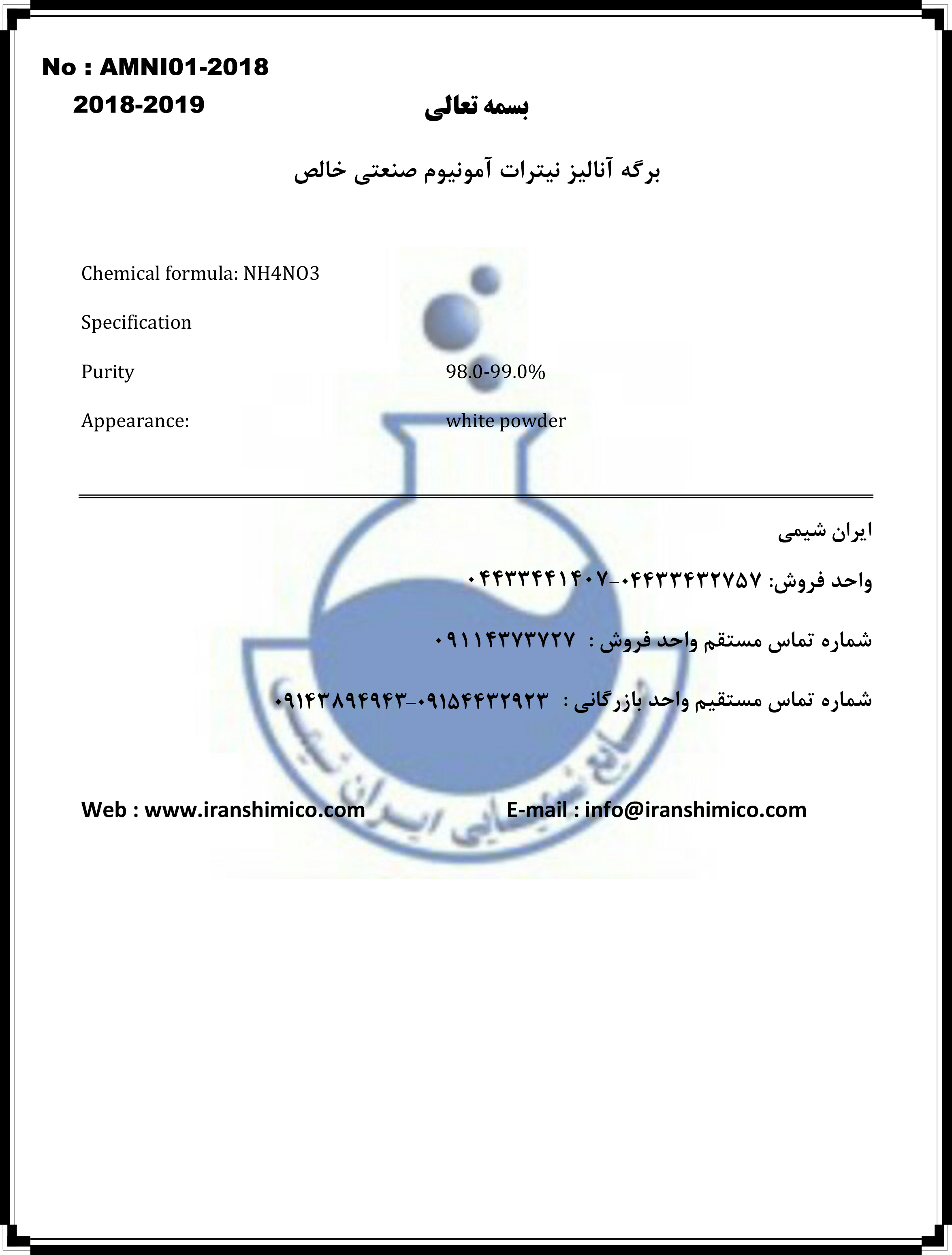 این بخش مخصوص فروش نیترات آمونیوم صنعتی(Ammonium Nitrate) می باشد. در صورت نیاز به خرید ماده ی آزمایشگاهی آن به بخش فروش نیترات آمونیوم آزمایشگاهی مراجعه فرمایید.